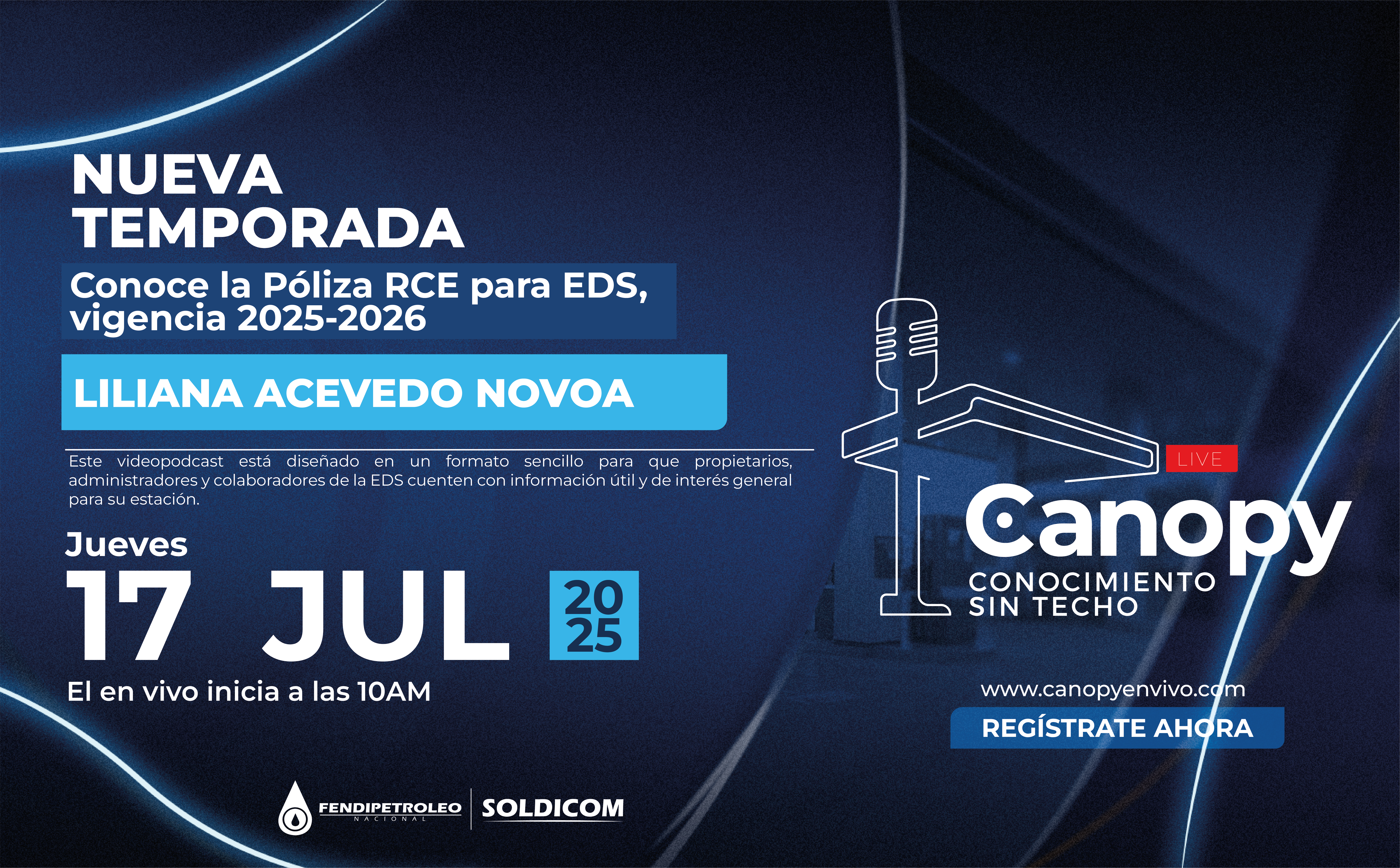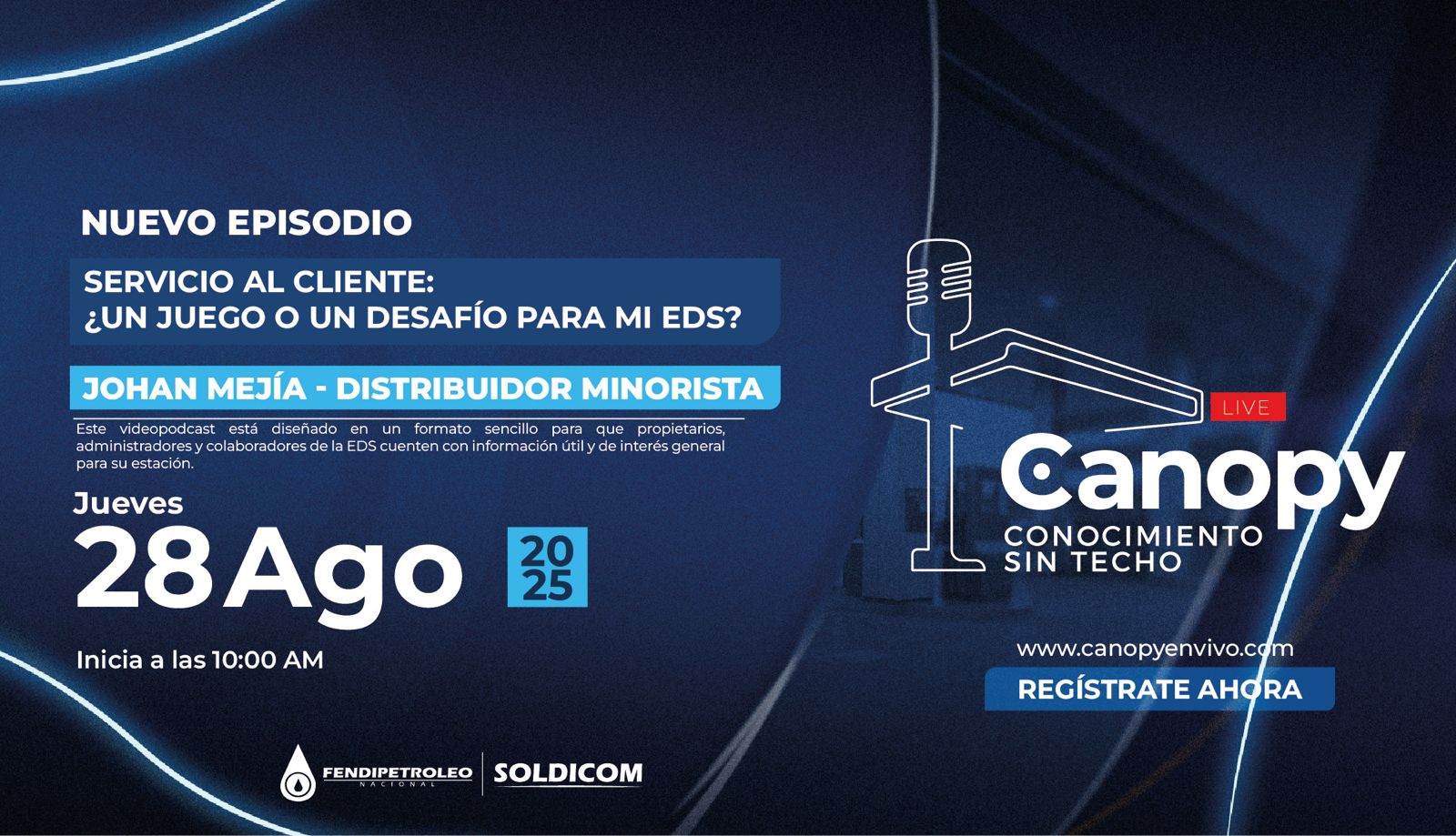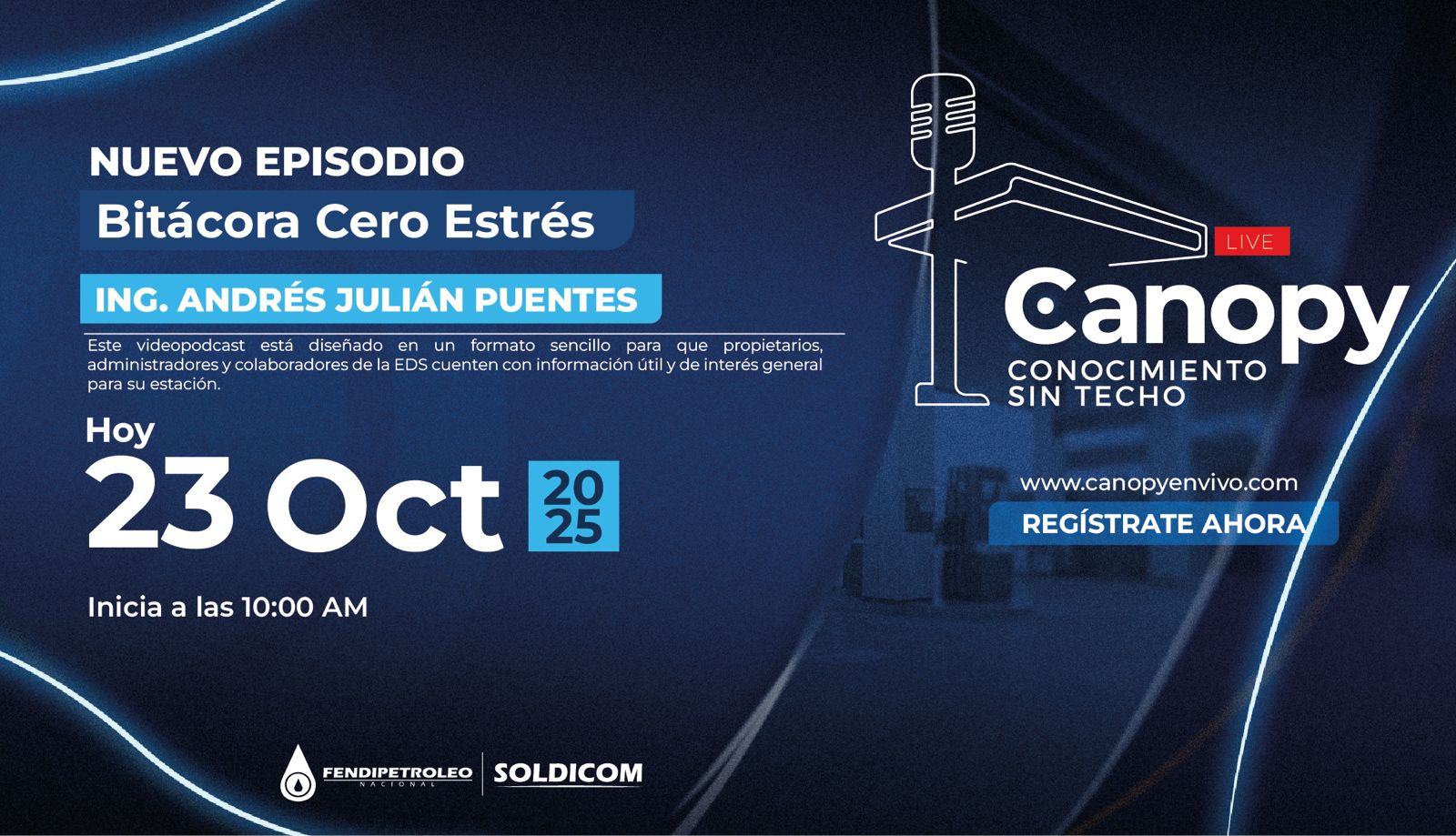 ‘Canopy en vivo – Conocimiento sin techo’ es una estrategia de formación complementaria que utiliza la tecnología del streaming en vivo para llevar conocimiento específico a los distribuidores minoristas de combustibles aportantes al Fondo Soldicom sobre temas de su interés. La estrategia se complementa con una landing de registro y emisión, que entrega a los participantes registrados un certificado de asistencia a cada una de las sesiones de capacitación.