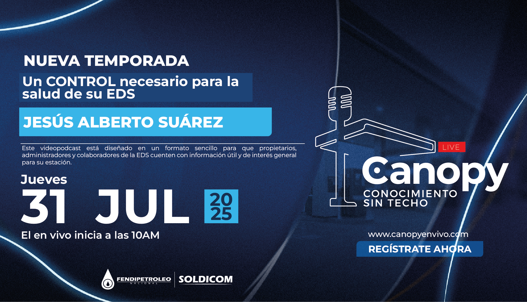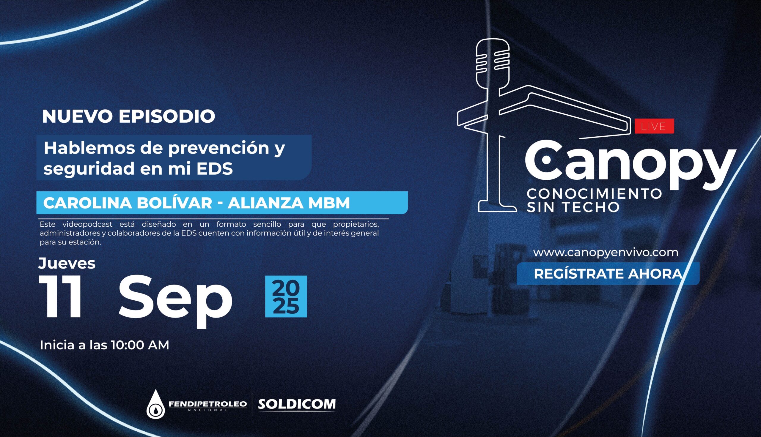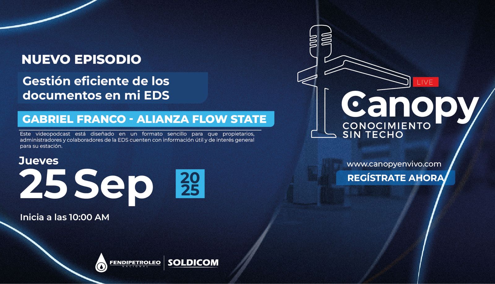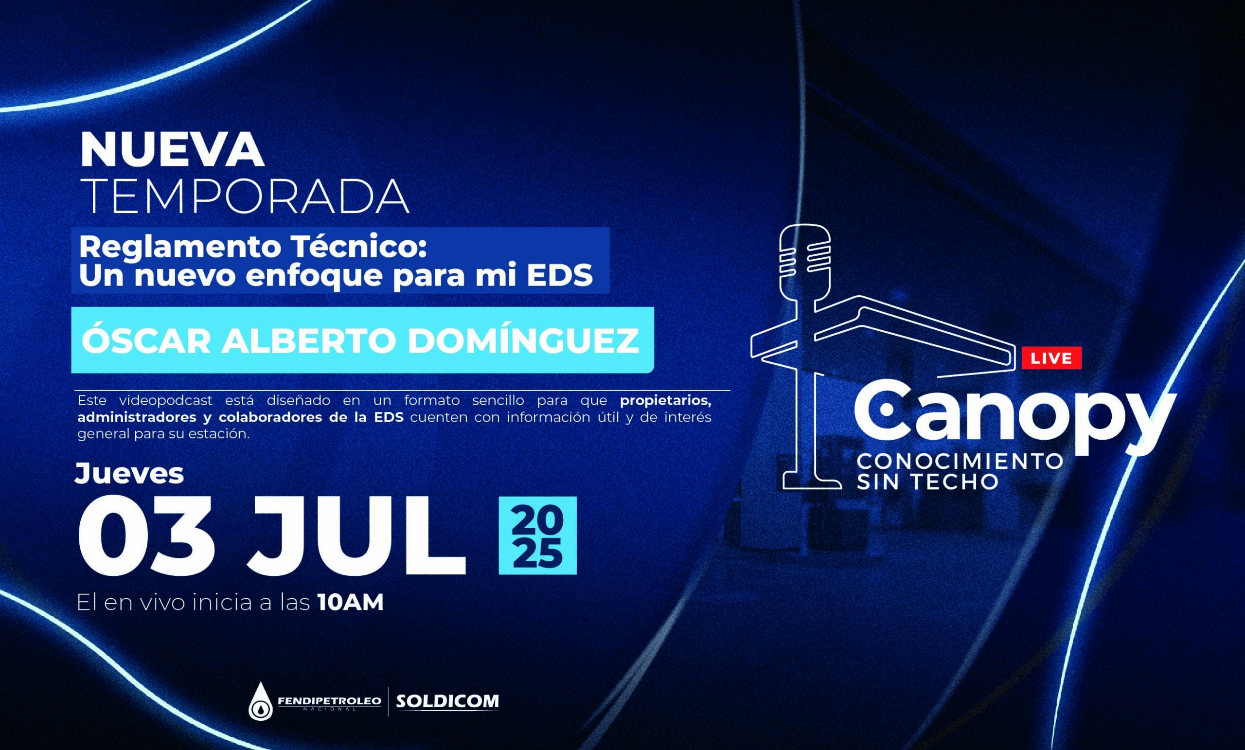 ‘Canopy en vivo – Conocimiento sin techo’ es una estrategia de formación complementaria que utiliza la tecnología del streaming en vivo para llevar conocimiento específico a los distribuidores minoristas de combustibles aportantes al Fondo Soldicom sobre temas de su interés. La estrategia se complementa con una landing de registro y emisión, que entrega a los participantes registrados un certificado de asistencia a cada una de las sesiones de capacitación.